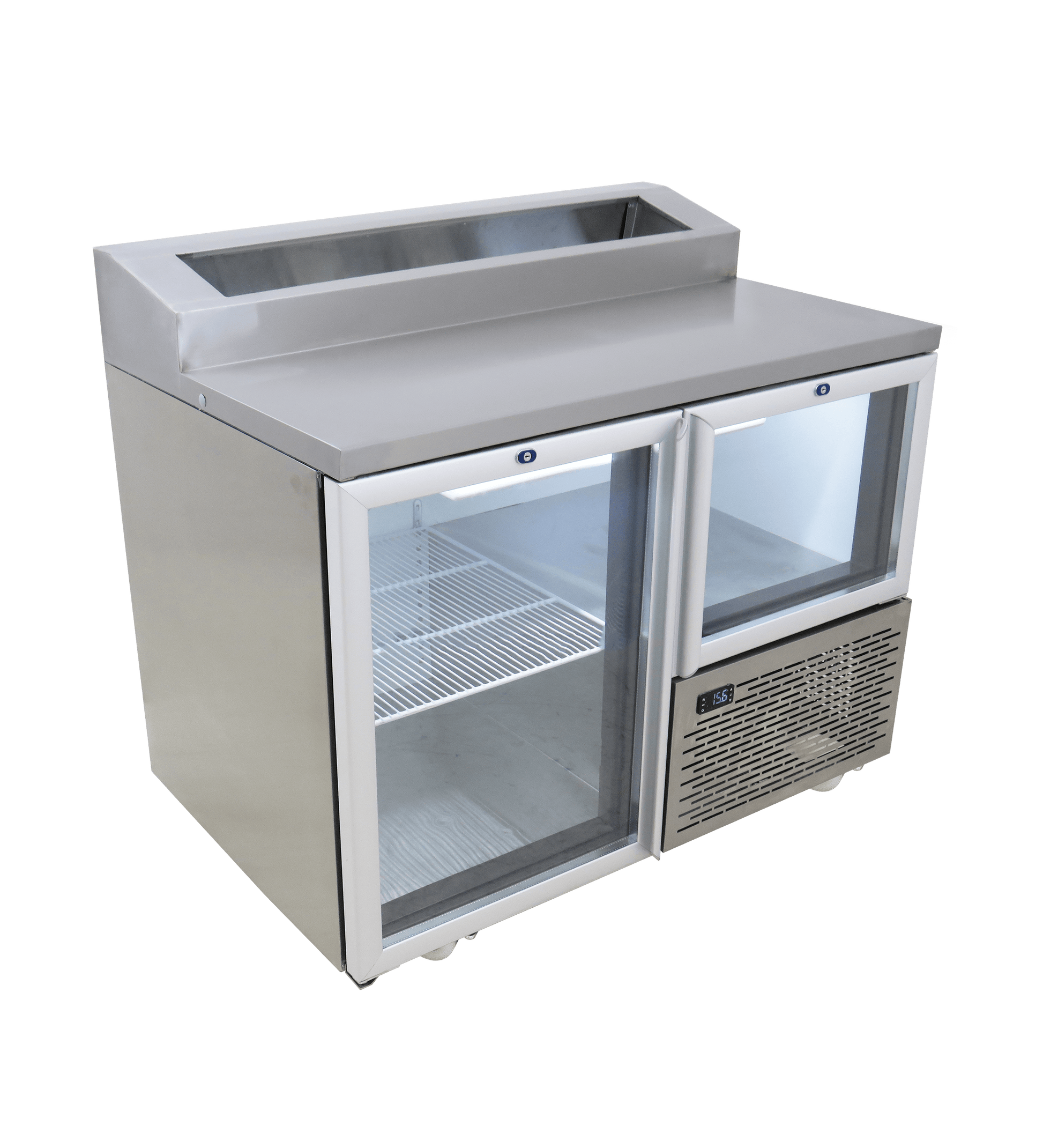 FRIDGE STAR UNDER BAR FRIDGE S/S EXTERIOR 1 AND HALF SWING GLASS DOORS INCL CASTORS AND EMS - PIZZA TOP
