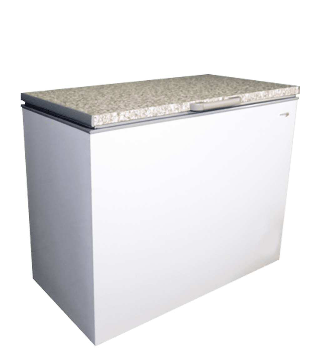 FRIDGE STAR CHEST FREEZER WITH WHITE EXTERIOR AND GRANITE TOP FLAP HINGE BACK STEP 12V ANOUDAN