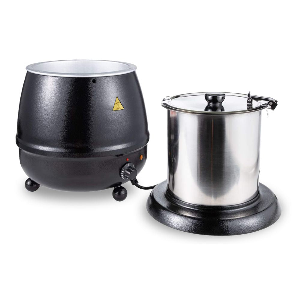 Introducing the Inoxserve 81010SP Soup Kettle – where sleek design meets exceptional functionality to revolutionize your soup warming experience. Crafted with precision and innovation, this soup kettle combines contemporary style with reliable performance, making it the perfect addition to any professional kitchen, catering event, or buffet setup.Featuring a stainless steel base with a sleek powder-coated finish, this soup kettle not only adds a touch of modern elegance to your countertop but also ensures durability and long-lasting performance, even in high-traffic environments.The seamless 304 stainless steel insert guarantees optimal hygiene and easy cleaning, maintaining the pristine quality of your soups with every use.With dimensions measuring Ø 330mm x 380mm high, this soup kettle offers a compact footprint without compromising on capacity, allowing you to maximize your serving space while accommodating a generous 10-liter capacity.Equipped with a temperature range of 0 to 95°C, this soup kettle provides precise control over your soup's temperature, ensuring it remains perfectly heated and ready to serve throughout your event.Whether you're serving classic favorites or innovative creations, the Inoxserve 81010SP Soup Kettle in striking black is sure to make a statement, impressing your guests and enhancing the overall dining experience.Upgrade your soup service with the perfect blend of style and performance – choose the Inoxserve 81010SP Soup Kettle for unparalleled quality and elegance. Order now and elevate your culinary endeavors to new heights!